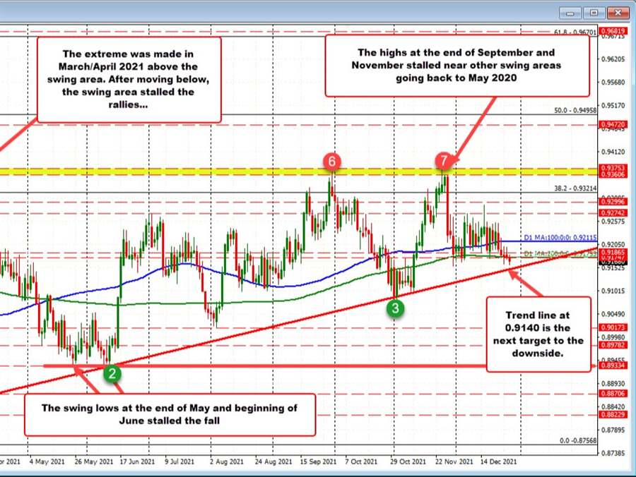 The USDCHF has seen a recovery to the upside in 2021 (flow out of the safety of the CHF and rise of the USD), but the gains have been somewhat limited, and the year is looking to end with a more bearish bias technically on the longer term we