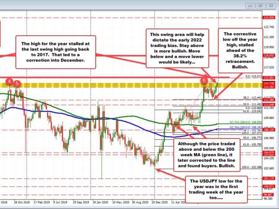 The year 2021 for the USDJPY can be characterized as a trend like move higher. The USDJPY pair had it's low for the year on January 6th (the first week of the trading year) at 102.586. The high for the year (with a few days left to go) peaked at 115.513 on