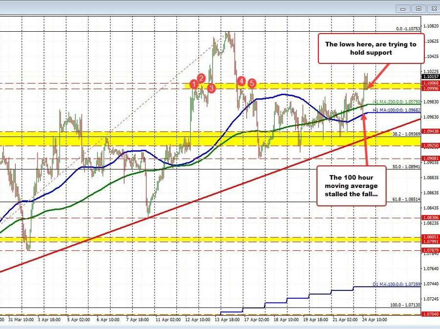 The EURUSD pair exhibits an upward trajectory as it trades close to its daily high. Analyzing the hourly chart, the day's price action began with the pair dipping to the 100-hour moving average (depicted by the blue line in the chart above). However, buyers found support at this level and pushed the price higher. The significance of this moving average level has increased as the week commences.