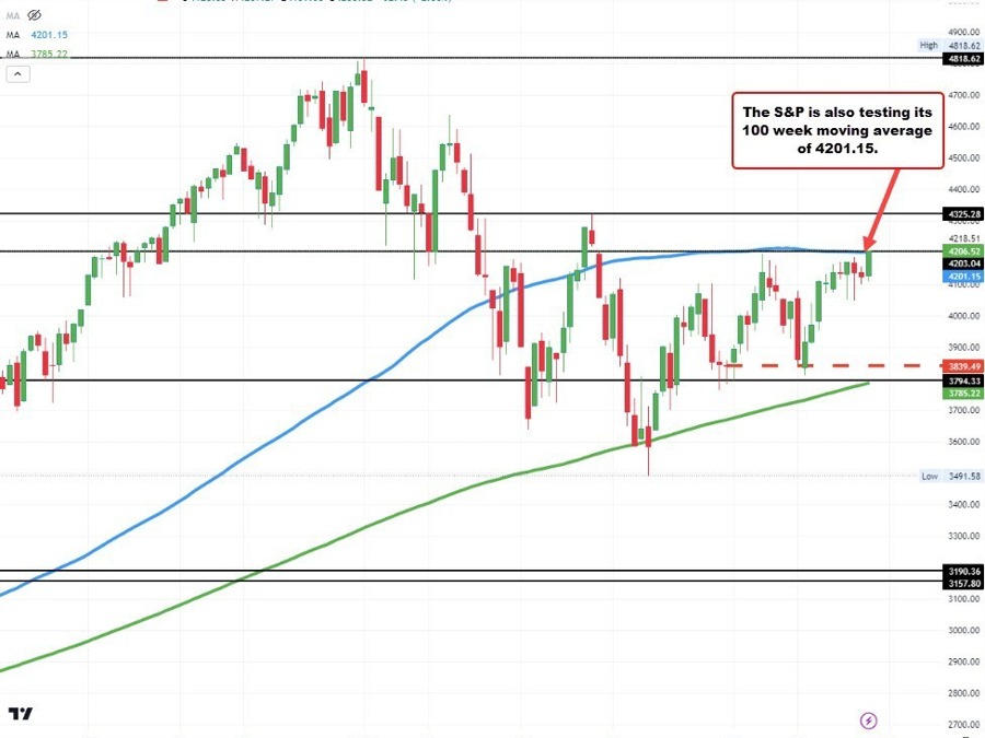The S&P index is above the 4200 natural resistance level and also extending above the 100-week moving average at 4201.17. A close above that level would be the 1st close above since the August 15, 2022 trading week (see blue line in the chart below)